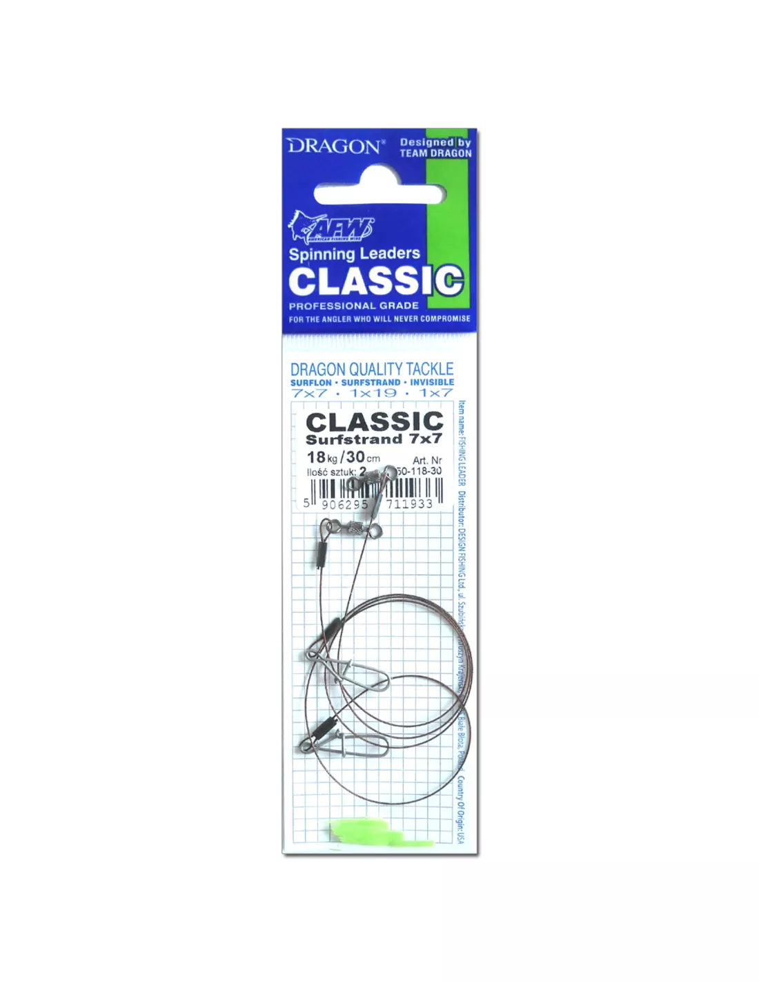 Snoek-Snoekbaars onderlijnen. Gemaakt van top kwaliteit staaldraad American Fishing wire Surfstrand. De Dragon AFW Surfstrand 7×7 Spinning leaders zijn soepel en extra dun in diameter daardoor vrijwel onzichtbaar onder water dus zeer geschikt om subtiel te verticalen op snoekbaars met shad of voor kleine plugjes en spinners.De onderlijnen worden met de hand gemaakt. Zo worden de sleeves met een sleevetang via luchtdruk met de juiste kracht vast geknepen.